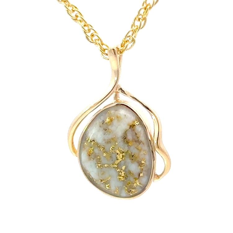 The pendant features a natural gemstone known as “Gold Bearing Quartz,” typically mined from deep underground. In most cases, gold found in quartz exists in microscopic amounts, making it virtually invisible. However, this pendant boasts an extraordinary rarity as it showcases a very scarce stone that is first cut into slabs, revealing the precious gold vein. Subsequently, skilled artisans cut, shape, polish, and mount it into a 14k gold setting. Embrace the allure of this remarkable Gold Bearing Quartz pendant and celebrate the natural beauty of this exceptional gemstone.