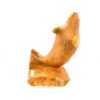 This piece is made of fossilized walrus ivory and features a bull moose. It is etched using the traditional art-form called scrimshaw, the decoration of bone or ivory objects, by Alaskan artist Dennis Sims. The piece is about 2″ tall and 3.5″ wide.