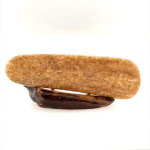 This piece is made of fossilized walrus ivory and features a caribou. It is etched using the traditional art form called scrimshaw, the decoration of bone or ivory objects, by Alaskan artist Dennis Sims of Houston, Alaska. It is about 2″ tall and 5″ wide.