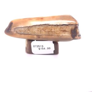 This piece is made of fossilized walrus ivory and features a bald eagle with mountains in the background. It is etched using the traditional art-form called scrimshaw, the decoration of bone or ivory objects, by Alaskan artist Dennis Sims of Houston, Alaska. It is about 1.5″ tall and 2.5″ wide.