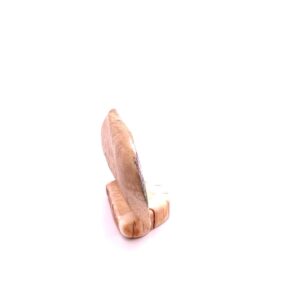 This piece is made of fossilized walrus ivory and features a wolf. It is etched by Dennis Sims of Houston, Alaska, using the traditional art form called scrimshaw. It is about 1.75″ tall and just over 3″ wide.