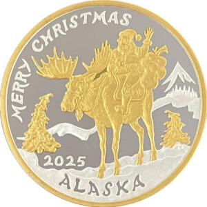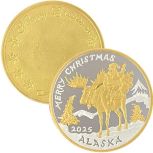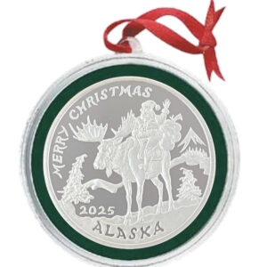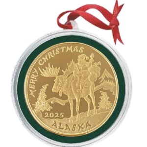 This ornament features Santa riding his moose, Alaskan style! It is dated 2025 and is available in various metals. Choose your metal type by using the drop down box. It is similar in size to a silver dollar. Comes in a special capsule with a red or green trim ring and is ready to hang on your tree. Personalize the ornament with a message engraved on the reverse.