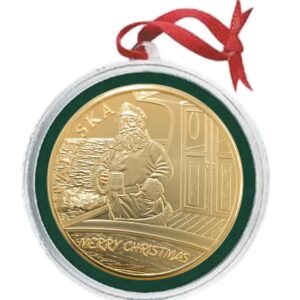 If you ever wondered what Santa does in his off-season, this is it. This Christmas medallion features Santa on the back of his fishing boat looking for some salmon or halibut to fill his freezer. It is available in golden bronze, 1 ounce .999 fine silver, 1 oz single gold relief (24k plating on parts of the front of the silver coin) and 1 oz. double gold relief (24k gold plating on both sides). It is similar in size to a silver dollar and is packaged in a Christmas airtight container with a red or green rim. This is a custom airtight capsule that is able to be hung on the tree as an ornament. The reverse is blank and your personalized message can be engraved.