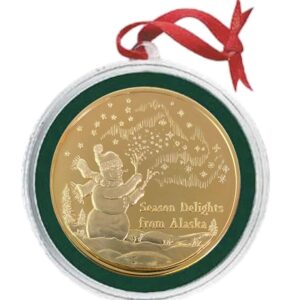 This Christmas medallion features a magical snowman in a field. It is available in golden bronze, 1 ounce .999 fine silver, 1 oz single gold relief (24k plating on parts of the front of the silver coin) and 1 oz. double gold relief (24k gold plating on both sides). It is similar in size to a silver dollar and is packaged in a Christmas airtight container with a red or green rim. This is a custom airtight capsule that is able to be hung on the tree as an ornament. The reverse is blank and your personalized message can be engraved.