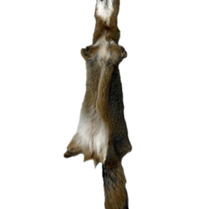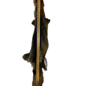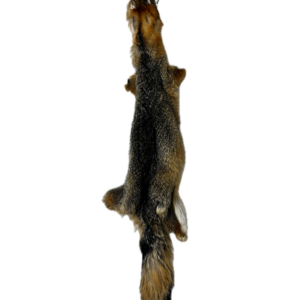 This is a 41″ grey fox pelt. Grey fox pelts are characterized by a coarse, salt and pepper grey coat with rusty red flanks and a distinct black tipped tail, which is the distinct difference from red fox.