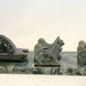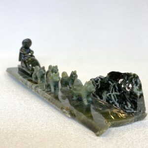 This hand carved jade dog musher, sled and dog team is almost 9 inches long. We have 2 teams to choose from, a 5-dog team and a 6-dog team. The jade is mined in British Columbia, sent overseas to be carved, and then assembled in Alaska.