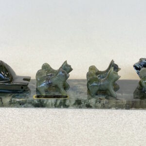 This hand carved jade dog musher, sled and dog team is almost 9 inches long. We have 2 teams to choose from, a 5-dog team and a 6-dog team. The jade is mined in British Columbia, sent overseas to be carved, and then assembled in Alaska.