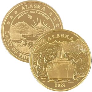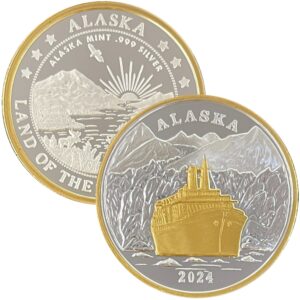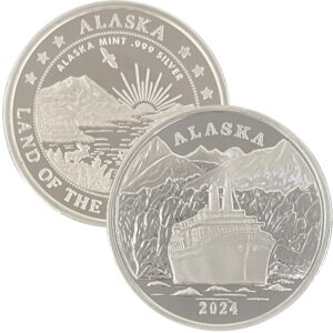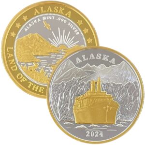 This medallion is available in golden bronze, 1 ounce .999 fine silver, 1 oz single gold relief (24k plating on front of the silver coin) and 1 oz double gold relief (24k gold plating on both sides). It is similar in size to a silver dollar and comes packaged in an airtight container and handsome gift box. The reverse features our popular “Land of the Midnight Sun” design.