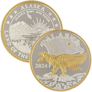 These medallions are minted in golden bronze, pure copper, 1 oz .999 fine silver, 1 oz single gold relief (24k plating on the front of the silver coin) and 1 oz double gold relief (24k gold plating on both sides). The 1 oz medallion is similar in size to a silver dollar. They are packaged in an airtight container and handsome gift box. The reverse features our popular “Land of the Midnight Sun” design.