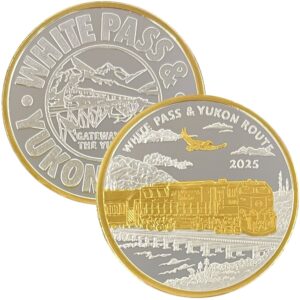 We’ve been making medallions for the White Pass & Yukon Route Medallion Railroad since 1990. It is available in golden bronze, 1 ounce .999 fine silver, 1 oz single gold relief (24k plating on front of the silver coin) and 1 oz double gold relief (24k gold plating on both sides). It is similar in size to a silver dollar and comes packaged in an airtight container and handsome gift box. The reverse features the White Pass & Yukon Route logo.