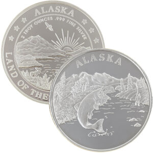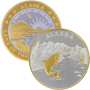 This medallion was one of our very first Alaskan designs, it depicts a classic summertime scene here in Alaska. A fisherman successfully casting his fly on target. It’s been such an awesome design that we cut a new die with the current date and mint it each year. These medallions are available in golden bronze, 1 oz .999 fine silver, 1 oz single gold relief (24k plating on front of the silver coin) and 1 oz double gold relief (24k gold plating on both sides). The 1 oz medallion is similar in size to a silver dollar. We also mint a 2 oz. “Alaska Size” version of this medallion that is a full 2 inches in diameter, it is available in both silver and double gold relief (the 2 oz. are not dated). They are packaged in an airtight container and handsome gift box. The reverse features our popular “Land of the Midnight Sun” design.