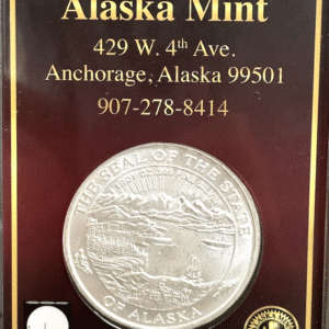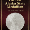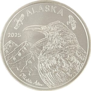 The 2025 Official State Medallion was designed by Alaskan artist, Meleia Allen. This Official State of Alaska Medallion is minted in proof-like quality. These medallions are struck with specially prepared frosted dies that give them a satin finish, and a reeded edge instead of the edge with lettering. This allows us to mint them quickly and sell for a lower price. Another nice thing about this surface is that they can be handled without leaving fingerprints, perfect for stacking and young coin collectors! They come packaged in a special plastic holder. The Official State of Alaska Medallions are the only medallions that we mint that feature the Seal of the State of Alaska on the reverse.