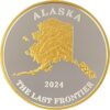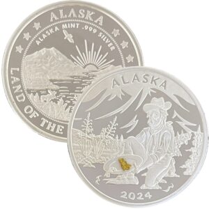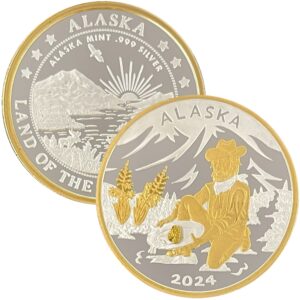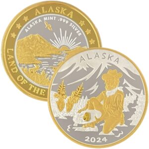 These medallions are available in golden bronze, 1 oz .999 fine silver, 1 oz single gold relief (24k plating on front of the silver coin) and 1 oz double gold relief (24k gold plating on both sides). We put a natural gold nugget in the gold pan of each of the silver and gold relief medallions. The 1 oz medallion is dated 2024 and is similar in size to a silver dollar and it is packaged in an airtight container and handsome gift box. The reverse features our popular “Land of the Midnight Sun” reverse.