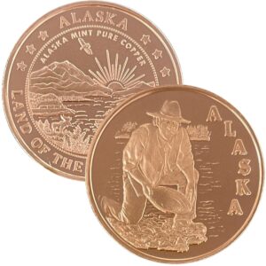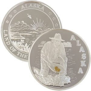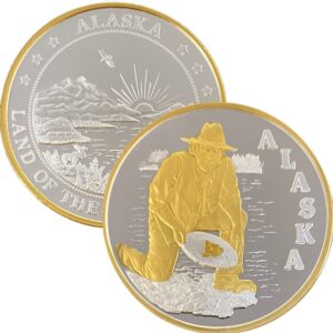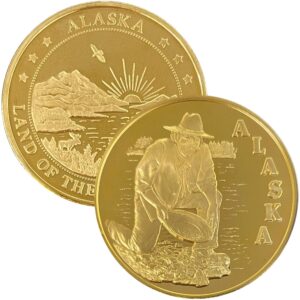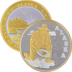 This medallion features our famous “Panner Joe” finding the gold he is after. A natural Alaskan gold nugget is attached to the silver, and gold relief coins. These medallions are available in pure copper, golden bronze, 1 oz .999 fine silver, 1 oz single gold relief (24k plating on the front of the silver coin) and 1 oz double gold relief (24k gold plating on both sides). We also mint a 2 oz. “Alaska Size” version of this medallion that is a full 2 inches in diameter, it is available in both silver and double gold relief. These come packaged in an airtight container and handsome gift box. The reverse features our popular “Land of the Midnight Sun” design.