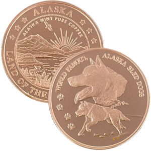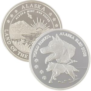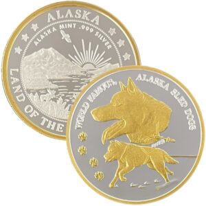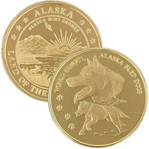 It is unknown when the first sled dog race was held. Humans have domesticated dogs for thousands of years, and sled dogs have been used for transportation in Arctic areas for almost as long. The first sled dog race to feature a codified set of rules was the All Alaska Sweepstakes which first took place in 1908. Our medallion features a couple of Alaskan Huskies.