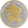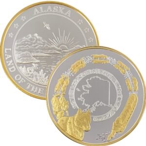 It is unknown when the first sled dog race was held. Humans have domesticated dogs for thousands of years, and sled dogs have been used for transportation in Arctic areas for almost as long. The first sled dog race to feature a codified set of rules was the All Alaska Sweepstakes which first took place in 1908. Our medallion features a long distance dog team running around the outer edge of the coin with a map of Alaska and Totemic pattern inside.