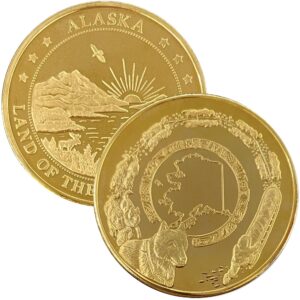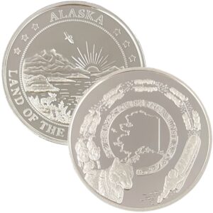 This medallion is minted in golden bronze, 1 oz .999 fine silver, 1 oz single gold relief (24k plating on the front of the silver coin) and 1 oz double gold relief (24k gold plating on both sides). The 1 oz medallion is similar in size to a silver dollar. They are packaged in an airtight container and handsome gift box. The reverse features our popular “Land of the Midnight Sun” design.