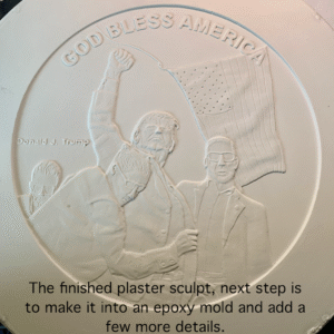 On July 13th 2024, while speaking at a rally in Butler Pennsylvania, former president Donald Trump literally dodged an assassin’s bullet. This medallion features an iconic image of Mr. Trump, surrounded by secret service agents, showing defiance, strength, resolve and courage after being shot.