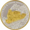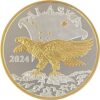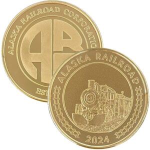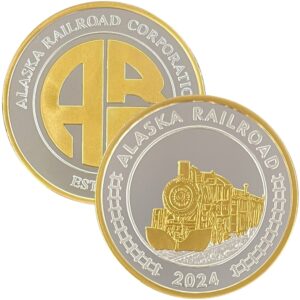 We’ve been making limited edition, serial numbered medallions for the Alaska Railroad since 1990. It is available in golden bronze, 1 ounce .999 fine silver, 1 oz single gold relief (24k plating on front of the silver coin) and 1 oz double gold relief (24k gold plating on both sides). It is similar in size to a silver dollar and is packaged in an airtight container and handsome gift box. The reverse features the Alaska Railroad logo.