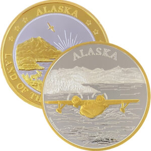 This medallion is available in golden bronze, 1 ounce .999 fine silver, 1 oz single gold relief (24k plating on the front of the silver coin) and 1 oz double gold relief (24k gold plating on both sides). It is similar in size to a silver dollar and is packaged in an airtight container and handsome gift box. The reverse features our popular “Land of the Midnight Sun” design.