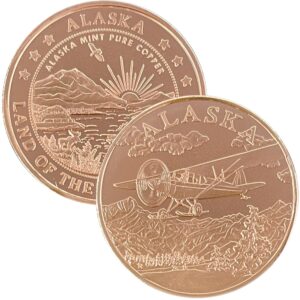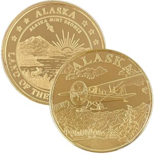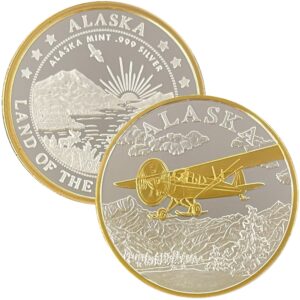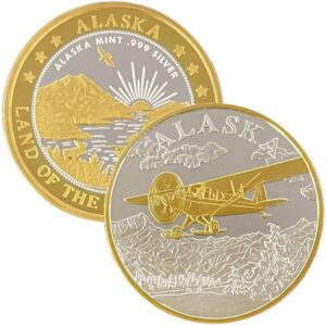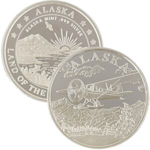 This medallion features a Super Cub with wheel skis heading to a glacier landing. It is available in golden bronze, pure copper, 1 ounce .999 fine silver, 1 oz single gold relief (24k plating on front of the silver coin) and 1 oz double gold relief (24k gold plating on both sides). It is similar in size to a silver dollar and is packaged in an airtight container and handsome gift box. The reverse features our popular “Land of the Midnight Sun” design.