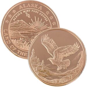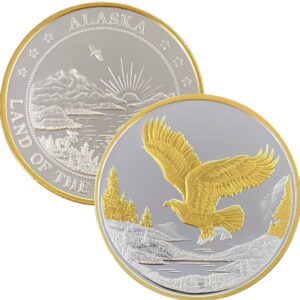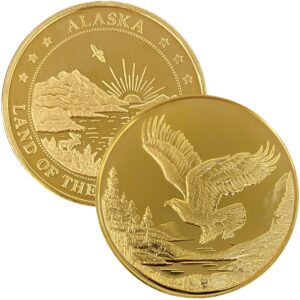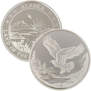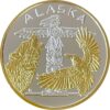 These medallions are available in pure copper, golden bronze, 1 oz .999 fine silver, 1 oz single gold relief (24k plating on the front of the silver coin) and 1 oz double gold relief (24k gold plating on both sides). The 1 oz medallion is similar in size to a silver dollar. We also mint a 2 oz. “Alaska Size” version of this medallion that is a full 2 inches in diameter, in both silver and double gold relief. They are packaged in an airtight container and handsome gift box. The reverse features our Land of the Midnight Sun design. This image is also available in smaller coins perfect for jewelry.