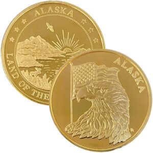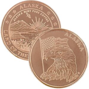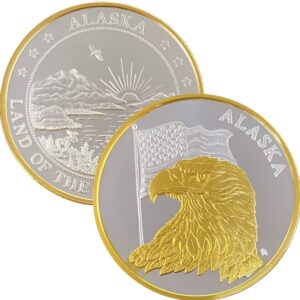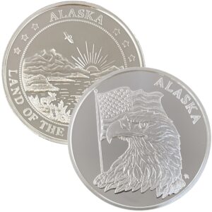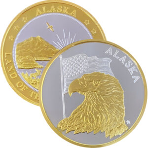 Alaska Mint features a different eagle design. Bald eagles are a common sight to see in Alaska. This medallion is available in pure copper, golden bronze, 1 oz .999 fine silver, 1 oz single gold relief (24k plating on the front of the silver coin) and 1 oz double gold relief (24k gold plating on both sides). The 1 oz medallion is similar in size to a silver dollar. They are packaged in an airtight container and handsome gift box. The reverse features our Land of the Midnight Sun design.