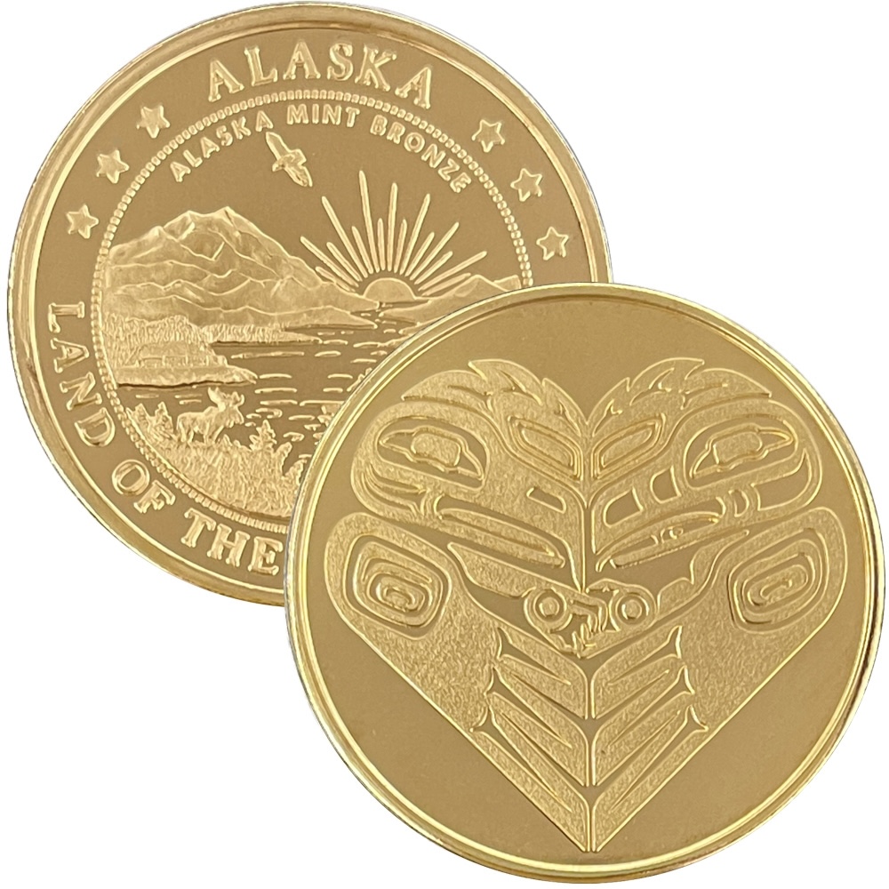 This coin design is a collaboration between Gunnar, here at the mint, and Steffani Coxwell. Steffani is a Tsimshian Alaska Native artist that lives in Soldotna, AK on the Kenai Peninsula. It features the totemic Love Birds design, an eagle and raven together forming a heart. This medallion is minted in golden bronze, pure copper, 1 oz .999 fine silver, 1 oz single gold relief (24k plating on the front of the silver coin) and 1 oz double gold relief (24k gold plating on both sides). The 1 oz medallion is similar in size to a silver dollar. They are packaged in an airtight container and handsome gift box. The reverse features our popular “Land of the Midnight Sun” design.