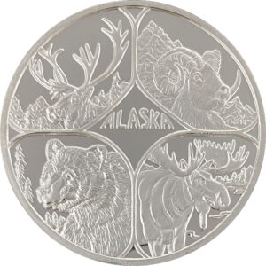 This medallion featuring the “Big Four” are the 4 animals everyone visiting Alaska wants to see. The Caribou, Dall Sheep, Moose and Grizzly Bear. The reverse is our Land of the Midnight Sun design. We call these medallions “Alaska Size” because of they are so much larger than a typical silver coin. It is minted from 2 ounces of pure silver, and is a full 2 inches in diameter! They are struck a single time on our press instead of the multi-struck proof medallions we make. They are still very nice quality but this allows us to sell them at a lower price, they come packaged in a velvet pouch.