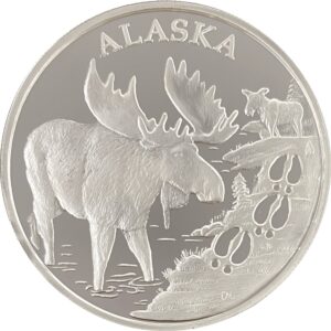 This medallion features a majestic bull moose grazing in a shallow pond. It is part of our “Tracks” series which shows many of Alaska’s critters and the tracks they leave. The reverse is our Land of the Midnight Sun design. We call these medallions “Alaska Size” because of they are so much larger than a typical silver coin. It is minted from 2 ounces of pure silver, and is a full 2 inches in diameter! They are struck a single time on our press instead of the multi-struck proof medallions we make. They are still very nice quality but this allows us to sell them at a lower price, they come packaged in a velvet pouch.