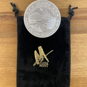 This medallion was one of our very first Alaskan designs, originally drawn in 1990, it depicts a classic summertime scene here in Alaska. A fisherman successfully casting his fly on target. The reverse is our Land of the Midnight Sun design. We call these medallions “Alaska Size” because of they are so much larger than a typical silver coin. It is minted from 2 ounces of pure silver, and is a full 2 inches in diameter! They are struck a single time on our press instead of the multi-struck proof medallions we make. They are still very nice quality but this allows us to sell them at a lower price, they come packaged in a velvet pouch.