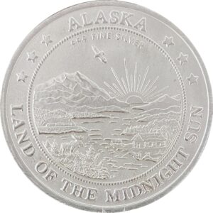 This is our 1 oz. pure silver Alaskan mosquito medallion in proof-like quality. These medallions are struck with specially prepared sandblasted dies that give them a satin finish. This allows us to mint them quickly and sell for a great price. Just a few dollars above the price of silver. The nice thing about this surface is that they can be handled without leaving finger prints, perfect for stacking! They come packaged in a plastic flip.