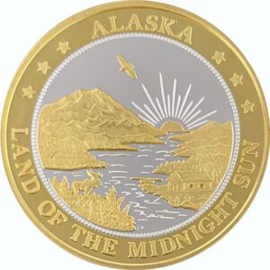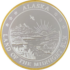 These medallions are available in golden bronze, 1 oz .999 fine silver, 1 oz single gold relief (24k plating on part of the silver coin) and 1 oz. double gold relief (24k gold plating on both sides). They are similar in size to a silver dollar and come packaged in an airtight container and handsome gift box. The reverse is our Land of the Midnight Sun design.