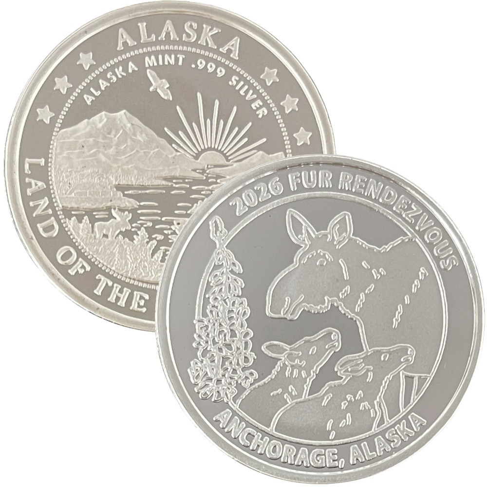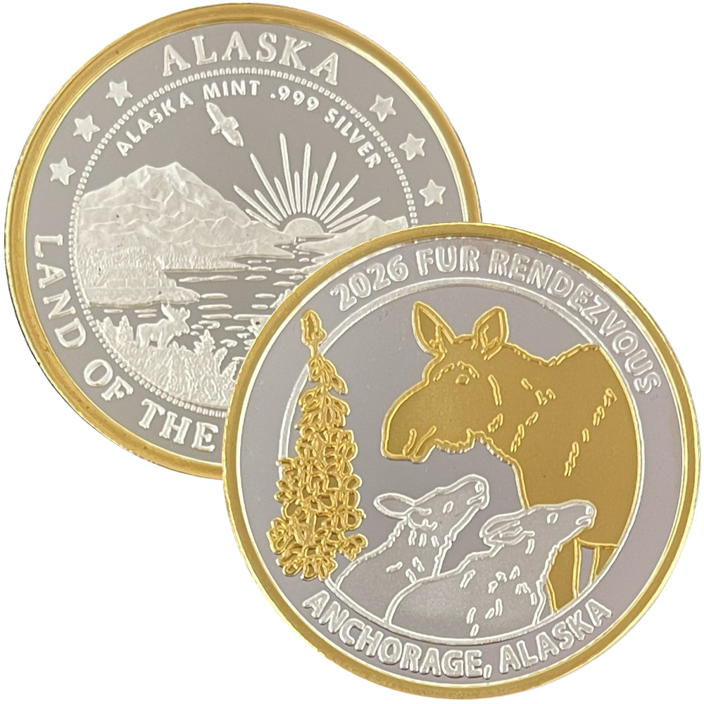 The 2026 design features a mother moose along with her twin calves and a beautiful Fireweed plant along the edge of the coin.
