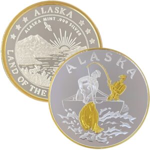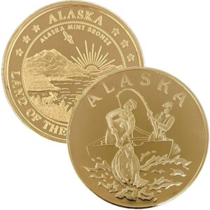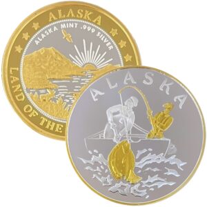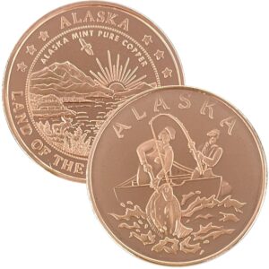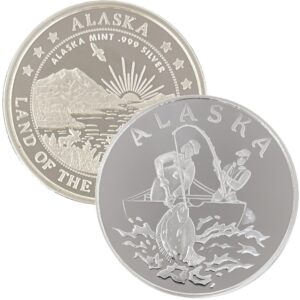 This medallion was designed by Alaskan artist Christy Matthews. It is available in pure copper, golden bronze, 1 oz .999 fine silver, 1 oz single gold relief (24k plating on the front of the silver coin) and 1 oz double gold relief (24k gold plating on both sides). It is similar in size to a silver dollar and comes packaged in an airtight container and handsome gift box. The reverse features our popular “Land of the Midnight Sun” design.