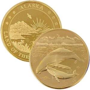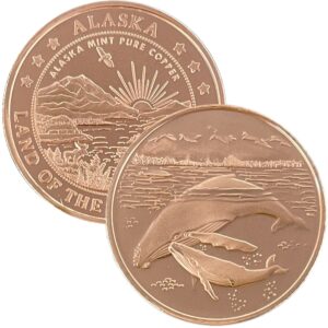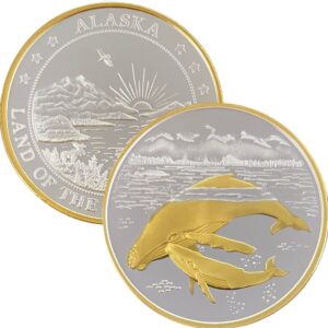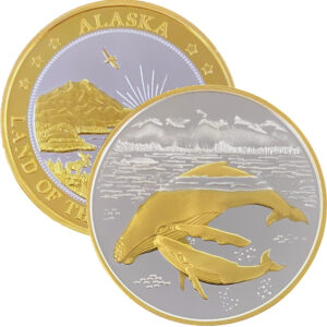 This medallion was designed by Alaskan Artist Christy Matthews. It is available in pure copper, golden bronze, and 1 oz .999 fine silver. IAlso available in 1 oz single gold relief (24k plating on the front of the silver coin) and 1 oz double gold relief (24k gold plating on both sides). It is similar in size to a silver dollar. Packaged in an airtight container and handsome gift box. The reverse features our popular “Land of the Midnight Sun” design.
