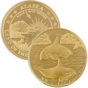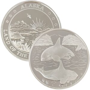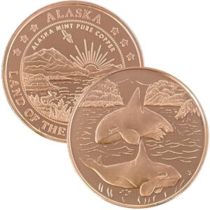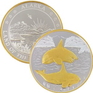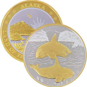 Designed by Alaskan artist Christy Matthews, this medallion is available in pure copper, golden bronze, 1 oz .999 fine silver, 1 oz single gold relief (24k plating on the front of the silver coin) and 1 oz double gold relief (24k gold plating on both sides). It is similar in size to a silver dollar and comes packaged in an airtight container and handsome gift box. The reverse features our popular “Land of the Midnight Sun” design.