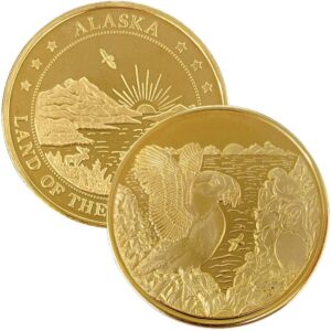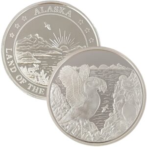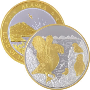 This medallion, designed by Alaskan artist Christy Matthews, is available in golden bronze, 1 oz .999 fine silver, 1 oz single gold relief (24k plating on the front of the silver coin) and 1 oz double gold relief (24k gold plating on both sides). It is similar in size to a silver dollar and comes packaged in an airtight container and handsome gift box. The reverse features our popular “Land of the Midnight Sun” design.