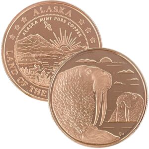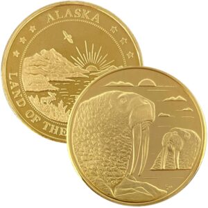 It is available in pure copper, golden bronze and 1 oz .999 fine silver. It is also available in 1 oz single gold relief (24k plating on the front of the silver coin) and 1 oz double gold relief (24k gold plating on both sides). The 1 oz medallion is similar in size to a silver dollar. They are packaged in an airtight container and handsome gift box. The reverse features our popular “Land of the Midnight Sun” design.