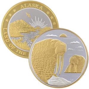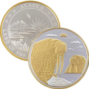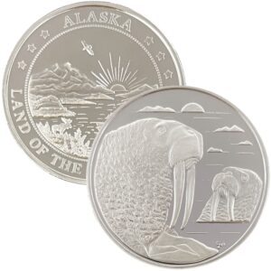 You cannot mistake the walrus with those magnificent tusks! This beautiful coin was designed by Christy Ruby. One of these coins were used in 2006 as a flipping coin to decide the winner of a political race in Western Alaska that had ended in a tie.