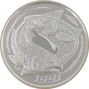 The 1991 medallion features swimming salmon, we’re not sure how many coins were minted, the company went out of business mid-year.