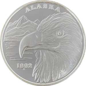 The 1992 medallion, the first Official Alaska State Medallion to be minted in Alaska, was designed by Joy Bax of Anchorage and features a Bald Eagle, it has a total mintage of 3457 Proof 1 oz Silver and Gold Relief combined.