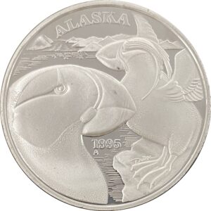 The 1995 medallion was designed by Debra Dubac of Anchorage, It features 2 Puffins, and has a total mintage of 7500 Proof 1 oz Silver and Gold Relief combined.