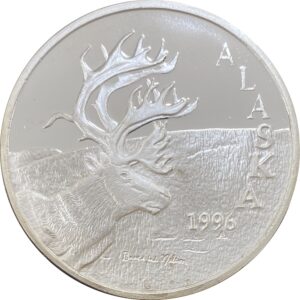 The 1996 medallion was designed by Bruce Nelson of Kodiak. It features a Caribou, and has a total mintage of 9790 Proof 1 oz Silver and Gold Relief combined.