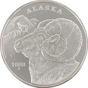The 1999 medallion was designed by Debra Dubac of Anchorage. It features a Dall Sheep, and has a total mintage of 8414 Proof 1 oz Silver and Gold Relief combined.