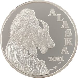 The 2001 medallion was designed by Alan Holt of Soldotna, Alaska. It features a Mountain Goat, and has a total mintage of 7213 Proof 1 oz Silver and Gold Relief combined.