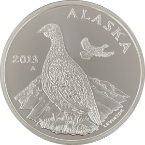 The 2013 medallion was designed by Ira Levinton of Anchorage. It features the Alaska State Bird, the Willow Ptarmigan and has a total mintage of 1450 Proof 1 oz Silver and Gold Relief combined.