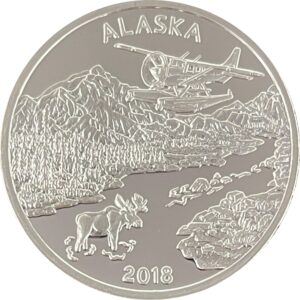The 2018 medallion was designed by Megan Warren of Anchorage. It features a Cessna 206 airplane flying over a valley and has a total mintage of 1820 Proof 1 oz Silver and Gold Relief combined.