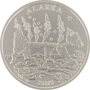 The 2019 medallion was designed by Natalie Treadwell of Anchorage. It features a Bear & Fireweed and has a total mintage of 1350 Proof 1 oz Silver and Gold Relief combined.