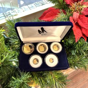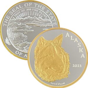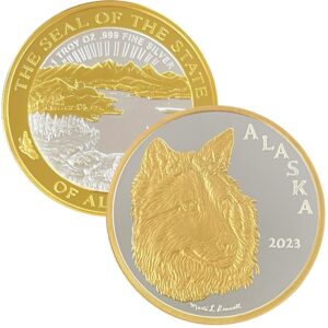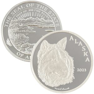 The 2023 Official State Medallion was designed by Alaskan artist, Marti Bennett. These medallions are 1 oz proof and are packaged in a box and airtite container. Proof sets are also available, these proof sets contain the 5 different size medallions packaged in airtite containers and a gift box. You can choose between single gold relief (gold on the fronts only) or double (gold on both sides) in the drop-down menu. We only build a few of these sets each year.